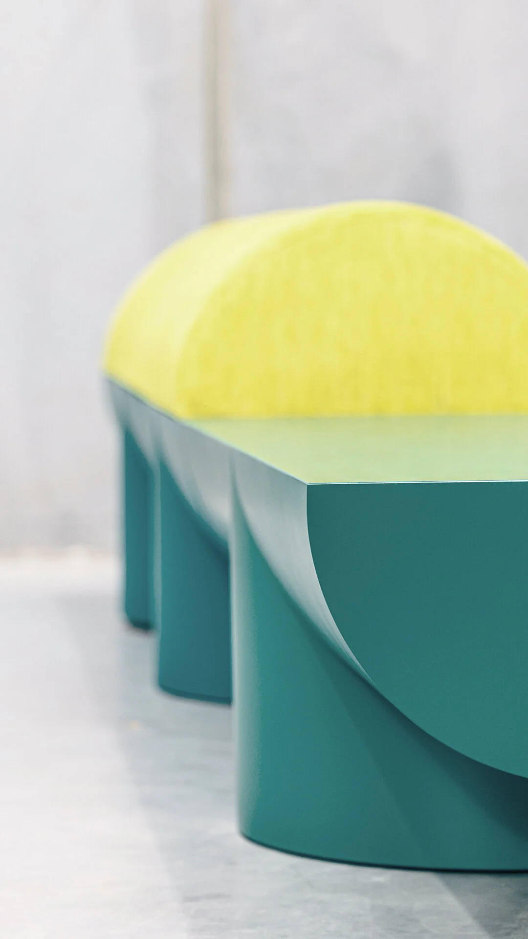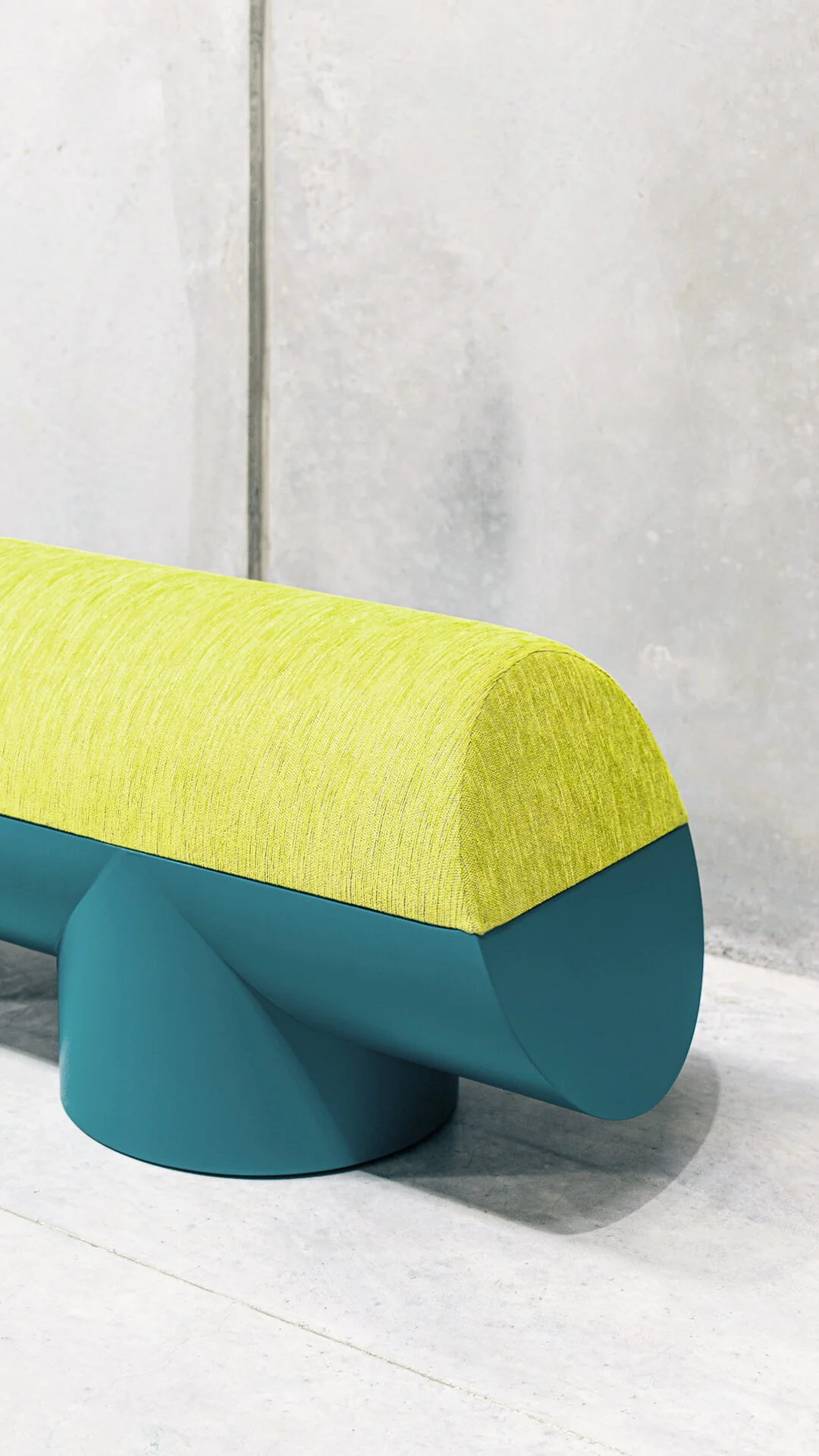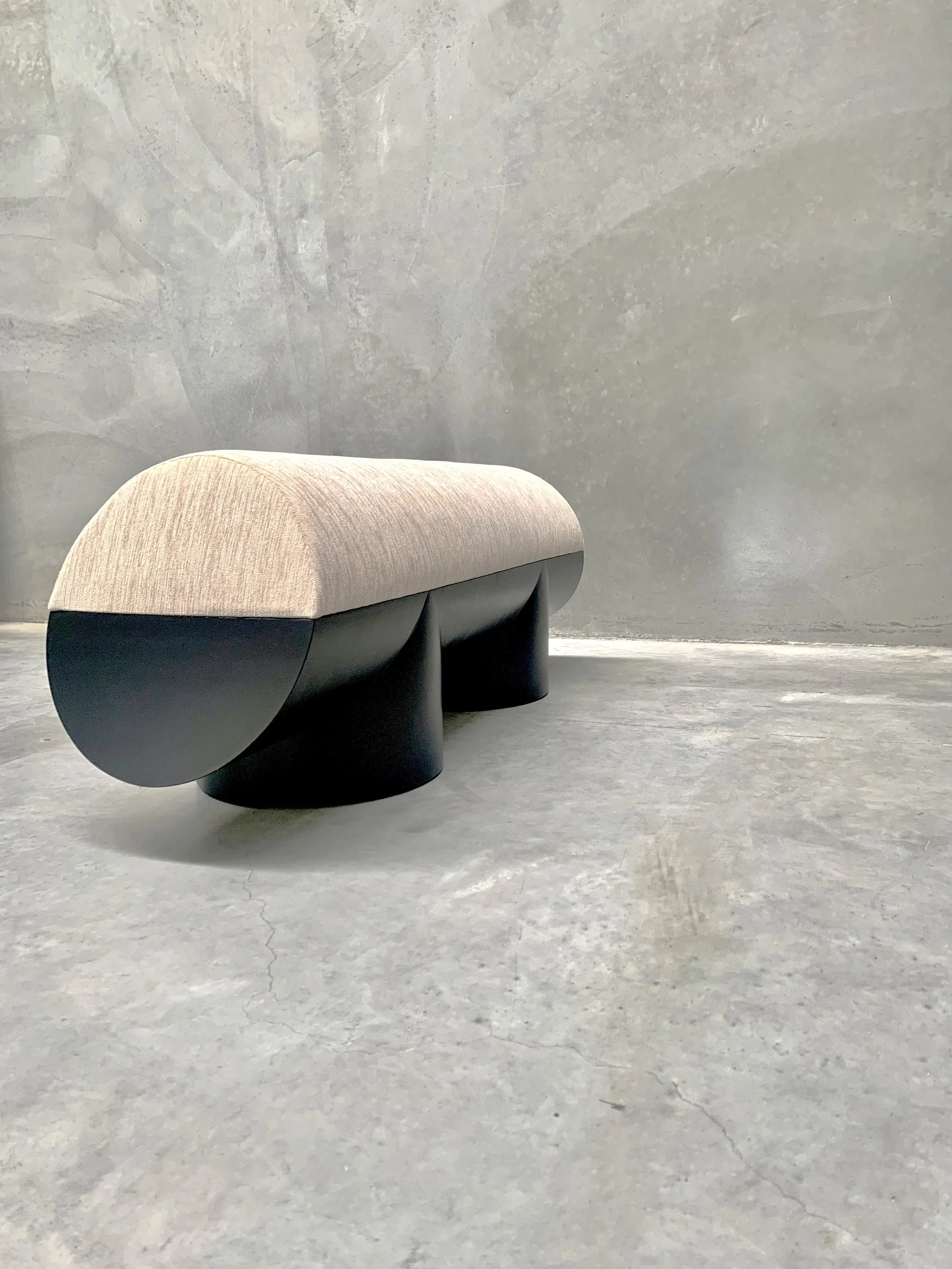 the horizontal cut in half extrusion creates a flat surface while the bench's upholstered top completes the tubular form.